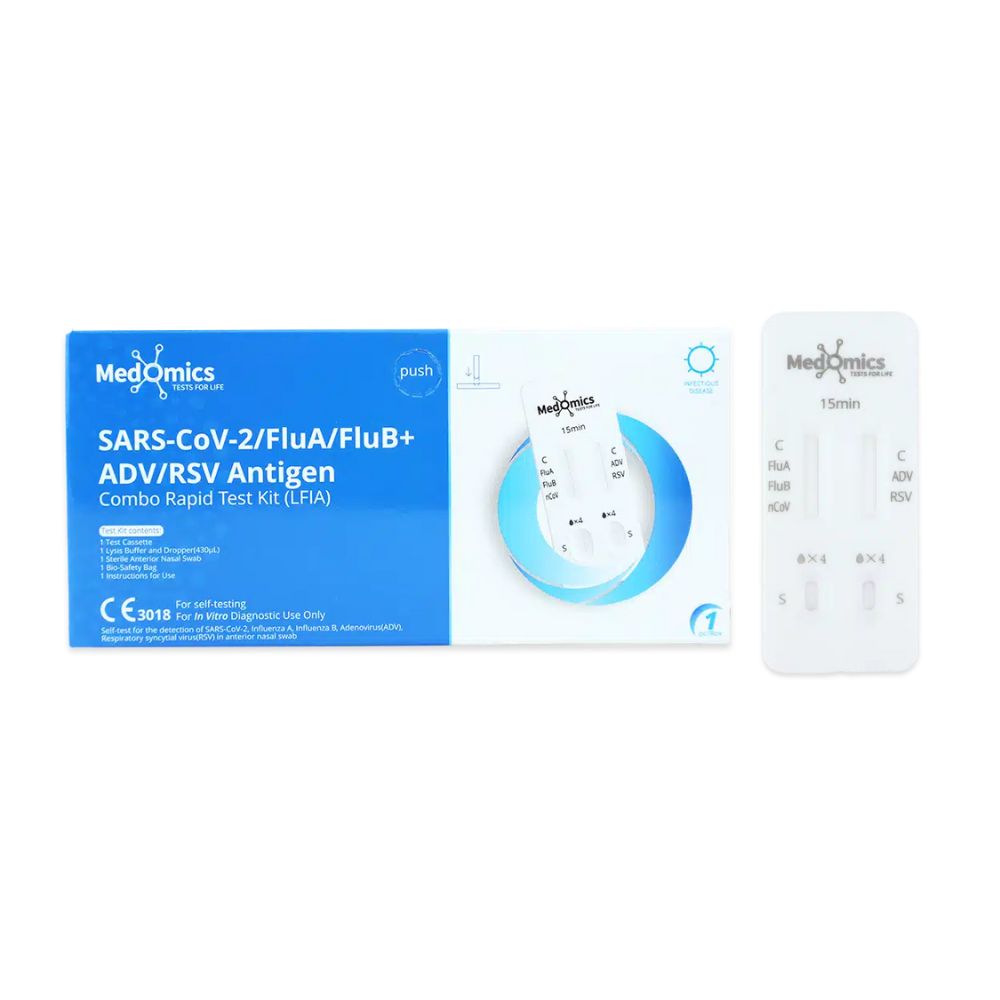 Test Medomics COMBO 5w1 jest nowoczesnym i innowacyjnym rozwiązaniem zapewniającym rzetelny wynik wykrywający pięć najczęściej występujących infekcji układu oddechowego. Wykonując jeden wymaz z nosa otrzymujesz 5 wyników po jednym na: SARS-CoV-2, wirusa grypy typu A i B, adenowirusa (ADV) oraz syncytialnego wirusa oddechowego (RSV). Możliwy do wykonania w warunkach domowych. Bezbolesny w wykonaniu, daje wynik w 15 minut od zrobienia.